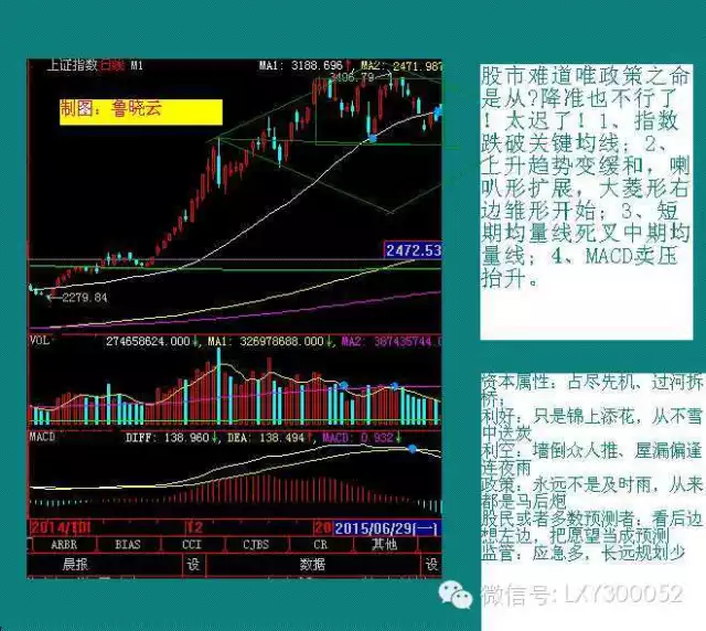 最新预测:2015年2月9日至2月13日预测:鉴于两间隔时间较短且相邻的消息之间,主力资金会反向运作,估计下周一,2月9日,上证50ETF期权推出之际,主板会出现指数反抽,之后进入英文字母Z之最后一横状态。前期指数已成按照预测完成菱形之左上角过程,眼前之进入中轨垂直下跌阶段,跌幅较猛,之后将分别两种走势,如“友好型”;是小菱形之右上角过程;标志是年前或者年后相对平稳----沪综指不跌破3100点或者3000点;第二种“爆裂型”,是大菱形之右下角构筑过程,标志是3100点或者3000点被跌破;从而上下对称。