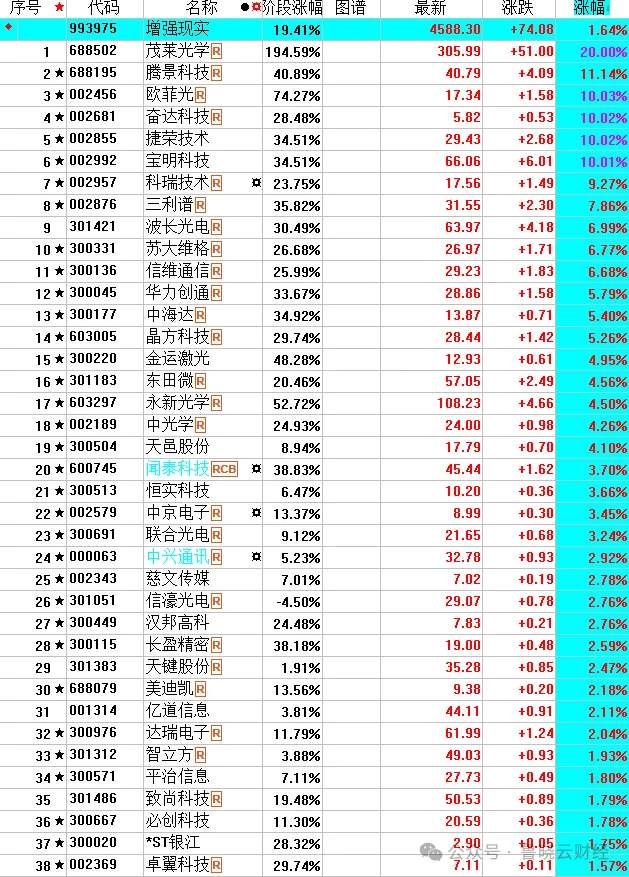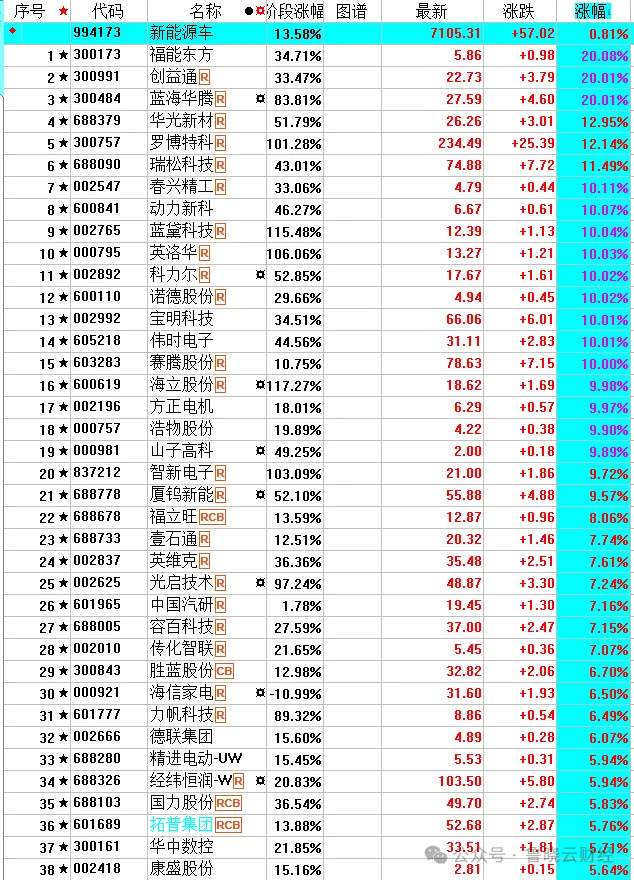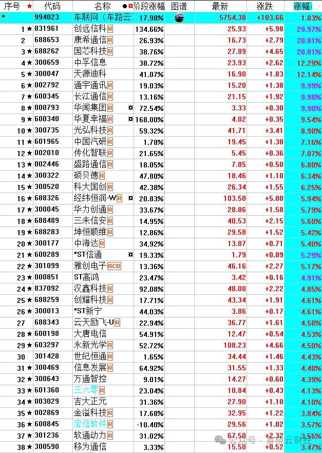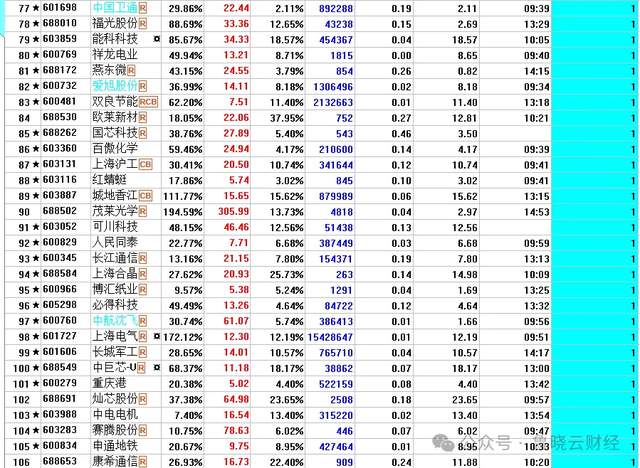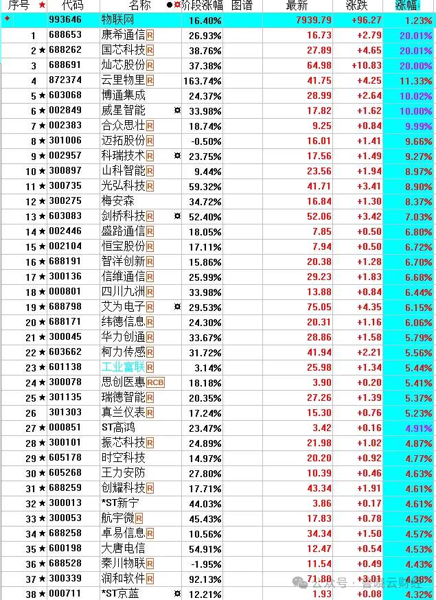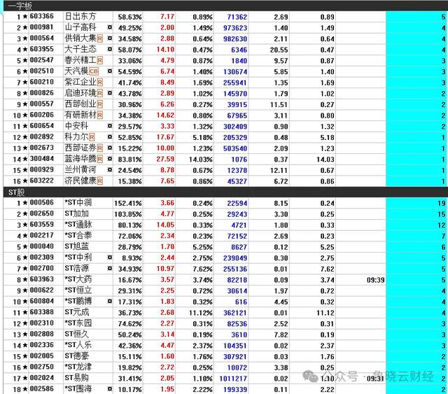 诸如低空经济、飞行汽车之蓝海华腾(300484)再度涨停;新能源车之英洛华(000795)等八连板继续涨停;车联网之华夏幸福(600340)十连板之后接近再度涨停的强势特征;TMT热点如浪潮信息(000977)续涨且涨停;风干股如黑芝麻(000716)六连板继续涨停等。